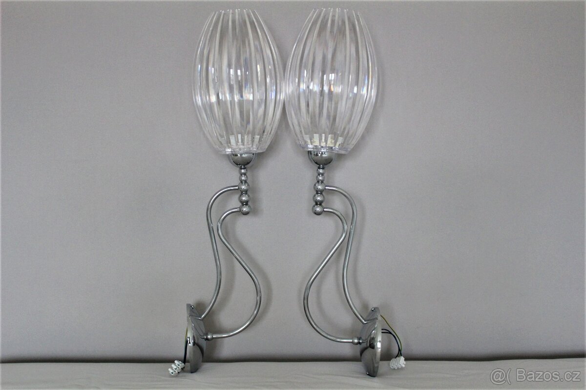 Nabízím dvě nové luxusní nástěnné lampy v barvě chromu a transparentních stínidel. Celková výška lamy je 70 cm, průměr stínidla 18cm. Hodí se např. nad noční stolky, či do předsíně kolem zrcadla, či do koupelny. Cena za obě lampy.