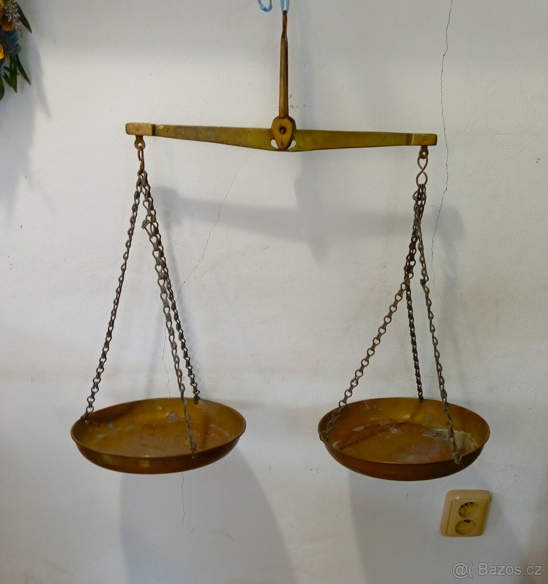 Závěsné váhy, měď a mosaz, V 58 cm, pr. misky 25 cm, 1299 kč