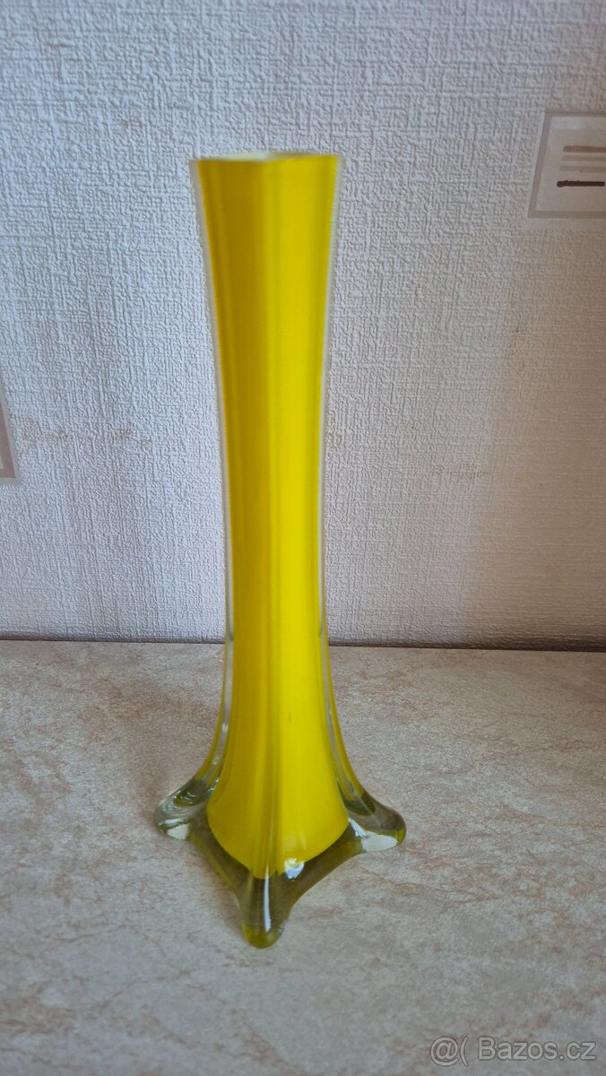 Žlutá skleněná vázička, ručně foukaná, typ "Eiffelova věž", 20cm