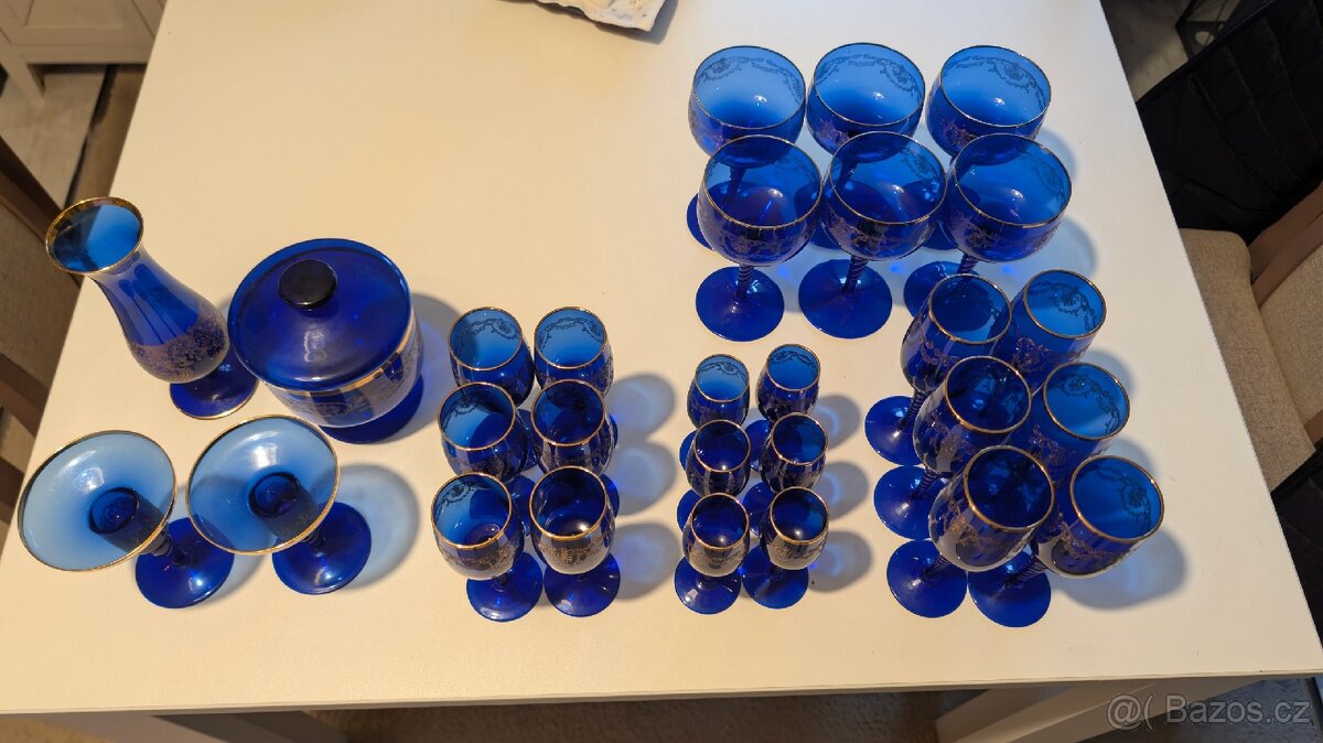 Sada sklenic 24ks+ 2 svícny + 1 dóza na cukr + 1 váza na květiny , modrá barva, broušené malované sklo cca z roku 1990 viz fotky.