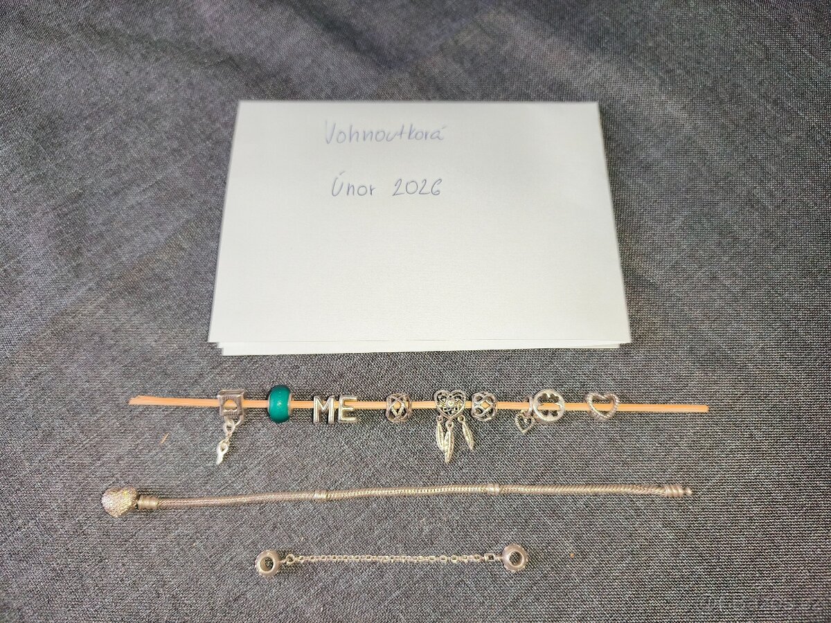 Pandora náramek - [24.2. 2026]Prodám originální náramek Pandora s třemi originál přívěsky ze starší kolekce (2 klipy a jeden provlékací). Délka náramku 17cm.