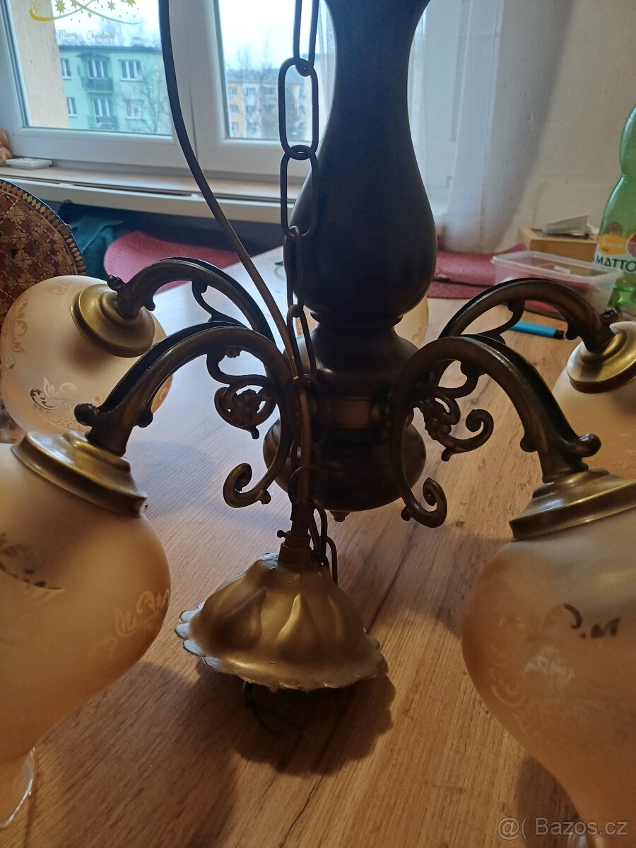 Lustr je ve velmi pěkném stavu, bez prasklin na skle (viz foto). Vhodný do bytu, na chalupu nebo do stylově zařízeného interiéru.
