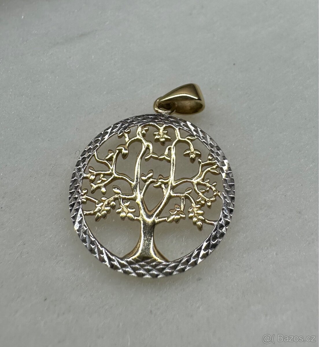 Zlatý bicolorní přívěsek je vyrobený ze 14 K žlutého a bílého zlata. Přívěsek je ve tvaru kolečka, které je broušené a uprostřed je strom života. Cenu nabídněte. Níže odkaz i s původní cenou.