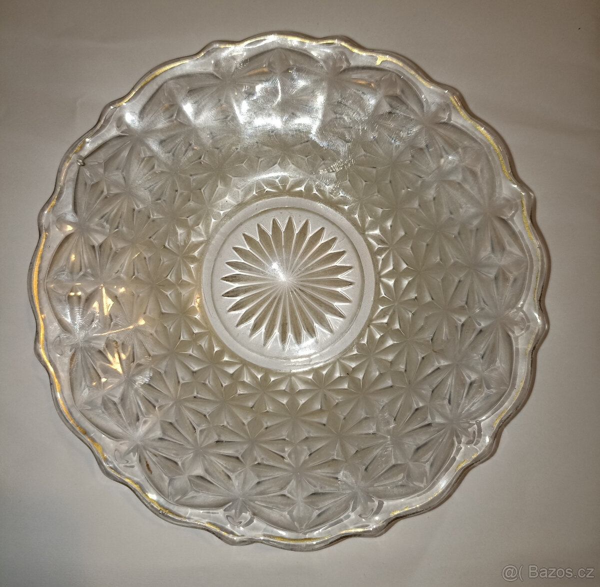Nabízím skleněné talířky, 3 ks, průměr 14 cm, ošoupaný zlatý lem.