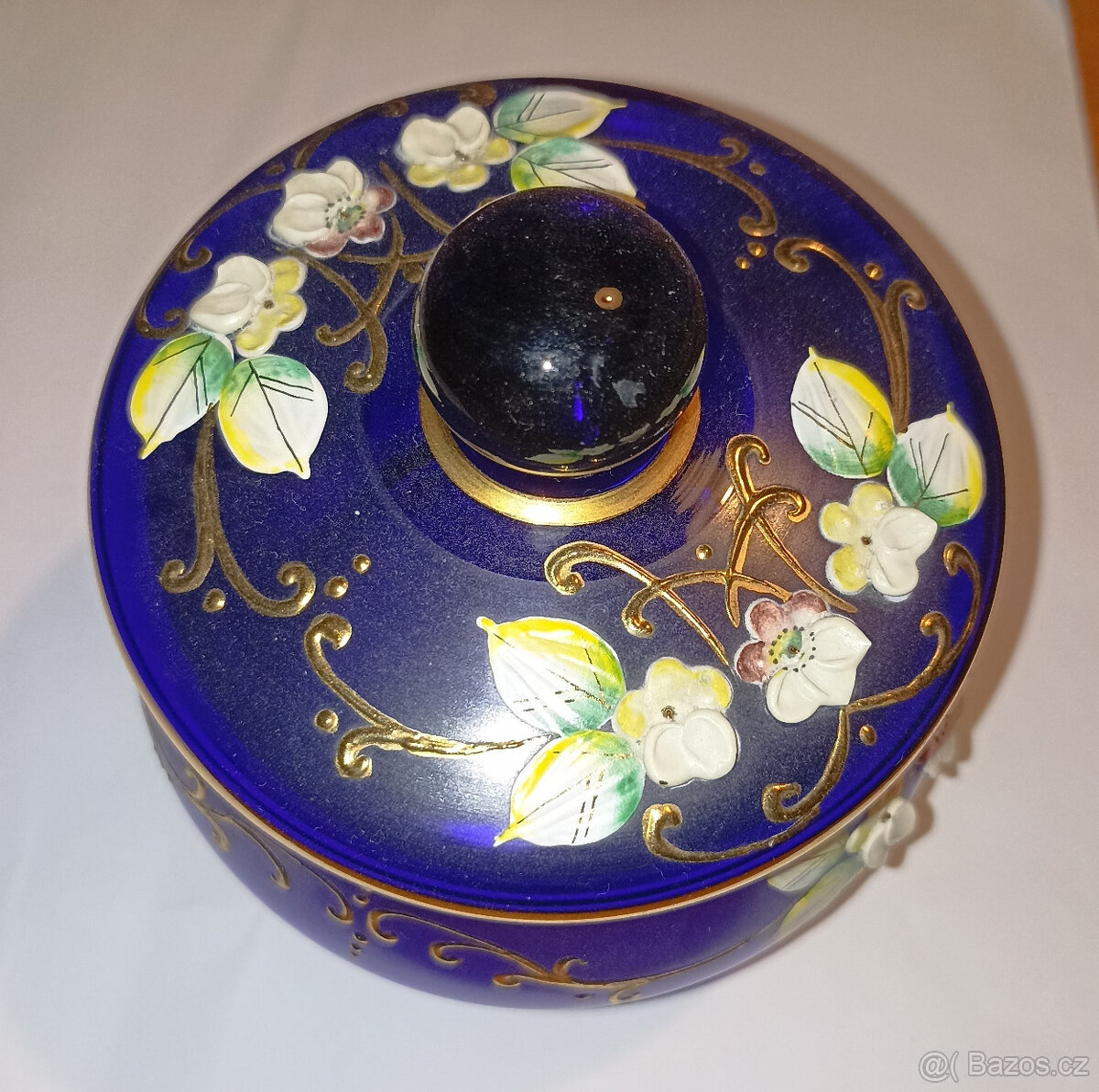 Prodám skleněnou dózu, kobaltové sklo s malovaným květinovým vzorem a zlacením, Nový Bor, průměr 11 cm, výška 11 cm.