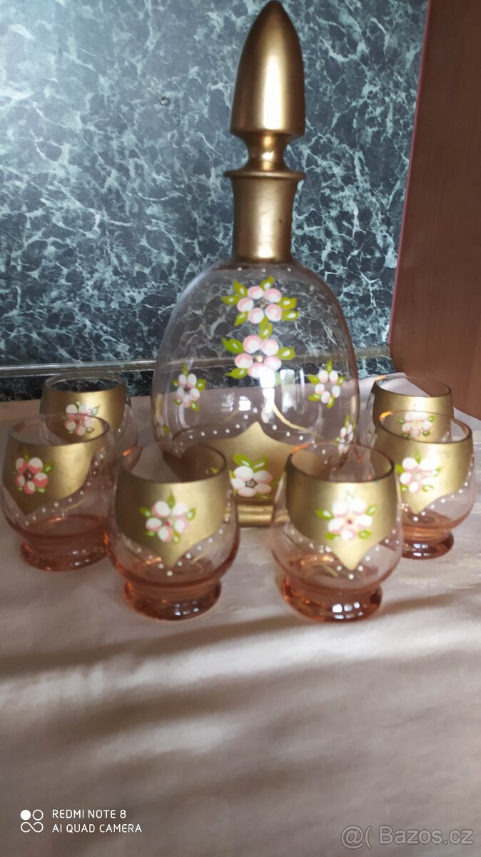 Karafa a 6 kusov skleníc, pozlátené, nepoškodené, ručná práca, veľmi staré. Cena 35 EUR.