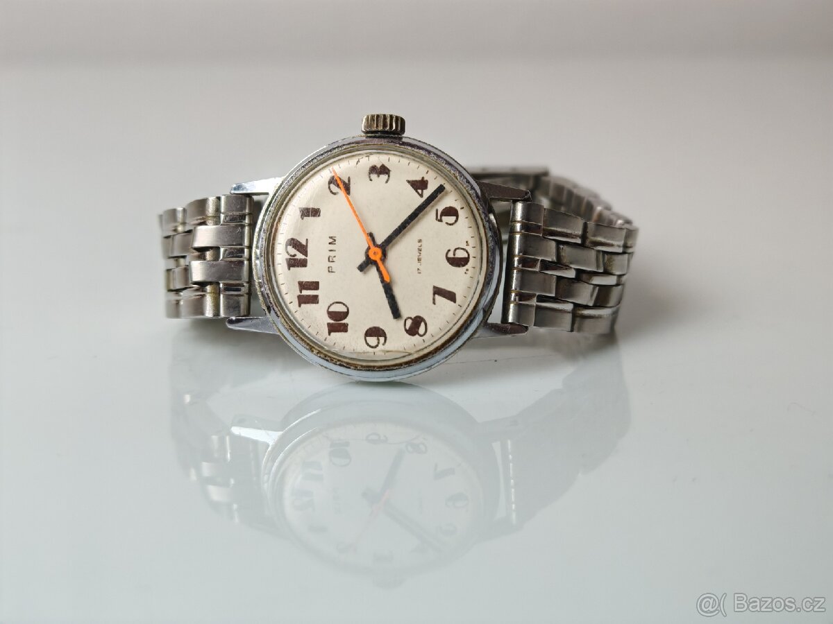 Nabízím pěkné staré dámské/dětské hodinky Prim průměr 28 mm, pěkný stav, jdoucí, přesnost nesledována. Sklíčko v horším stavu, dvě prasklinky, vše viz. foto. Neoriginální kovový tah.