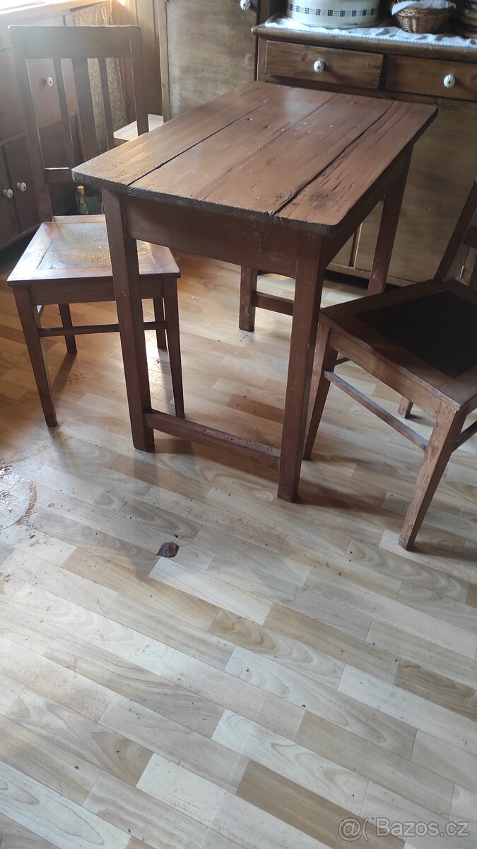 Prodám starý stůl (90x57cm., výška 81cm.) a dvě židle. Stůl bez aktivního červíka. Osobní odběr. Cena za komplet.