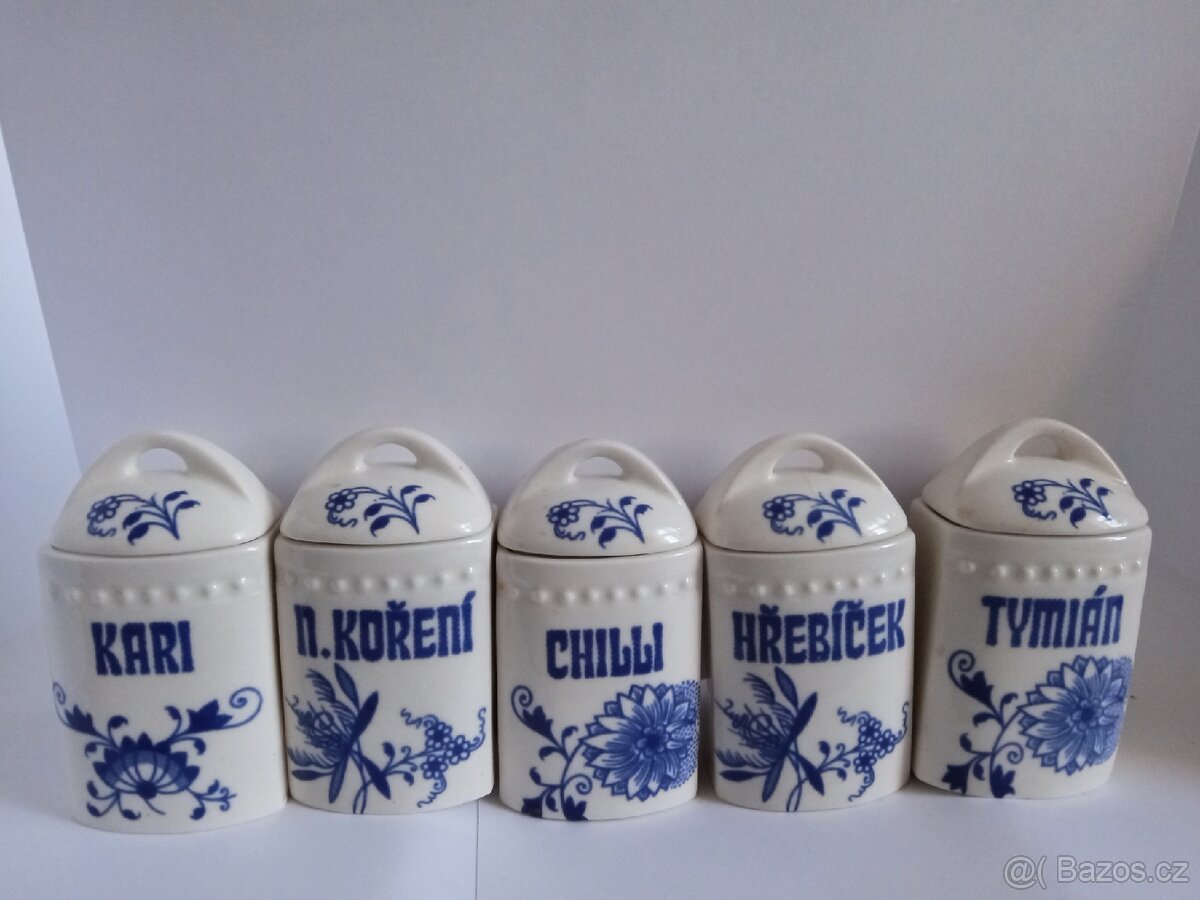Prodám krásnou retro sadu 5 keramických kořenek s víčky v klasickém modrobílém „cibulovém“ dekoru.