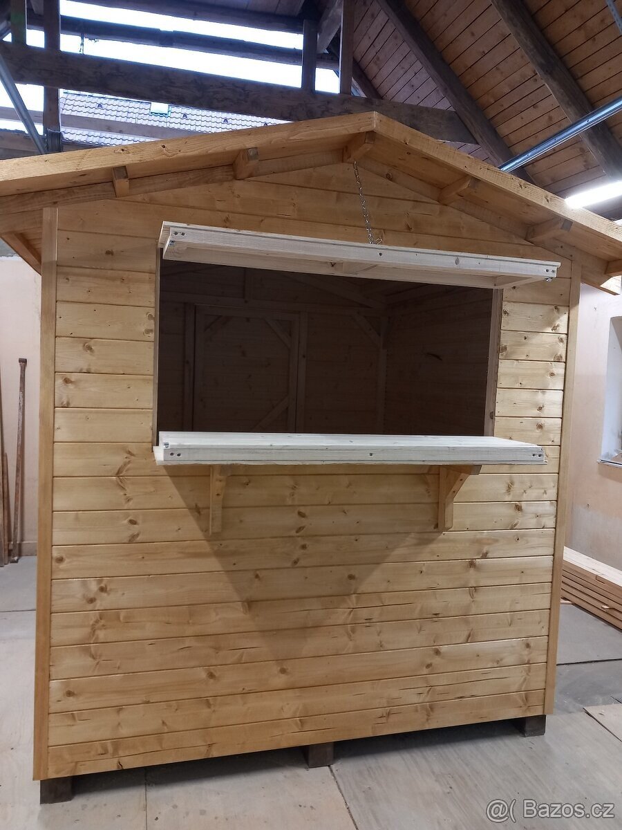 Prodám dřevěný prodejní stánek 200 x 200 x 230 cm. Sedlová střecha, střešní krytina asfaltová šindel. Pevná vázaná konstrukce se stabilní podlahou bez prohybu je opláštěna 15mm smrkovými palubkami v prvotřídní kvalitě. Výdejní okno o rozměru 140 x 70 cm. Po otevření jako stříška a výdejní pult.