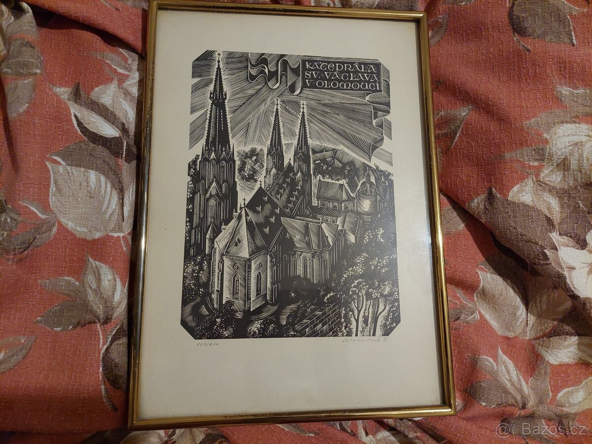 Prodám obraz - linoryt od malíře a grafika Františka Bělohlávka z Olomouce. K Bělohlávkovým doménám patřila po celá desetiletí grafika, knižní grafika, plakátová tvorba, malba a tvorba pro architekturu. Obraz je v kovovém rámu zlaté barvy, zaskleno. Obraz Katedrála Sv. Václava v Olomouci, je z roku 1984, signováno vpravo dole, výtisk 109/200. Osobní převzetí Litvínov nebo dopravu hradí kupující. Cenu nabídněte.