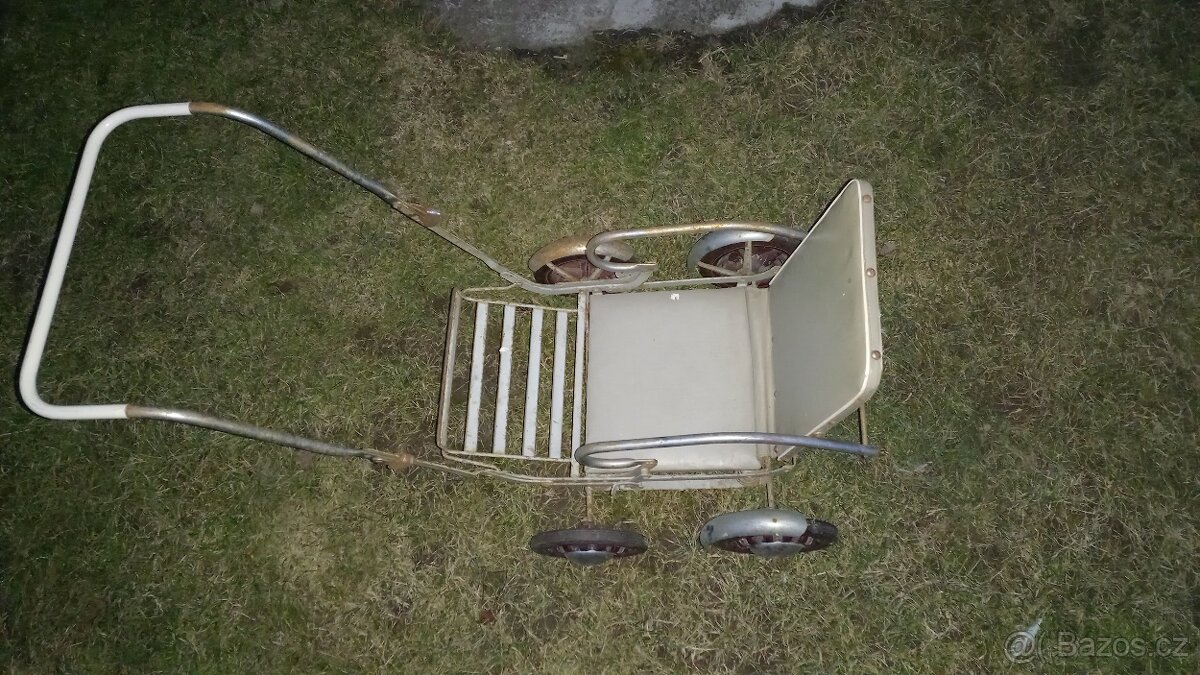 Retro kočárek (spíše pro panenky) - chybí jeden blatník, viz foto. + nabízíme různá kolečka ... rozměry pošlu zájemcům! Zdobená kola by měla patřit k servírovacímu stolku.