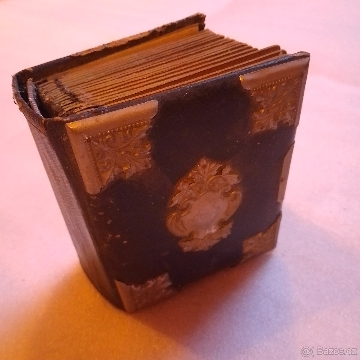 Prodám starožitné fotoalbum se starými fotografiemi.Album široké 5-6 cm ,má na přední vazbě zdobené kovové ozdoby se znakem uprostřed.Ozdoby v pořádku, vnitřek alba mírně poškozen,na svůj věk myslím stále solidní stav. Některé vnitřní stránky lehce natržené,fotky nepoškozeny - viz fota.