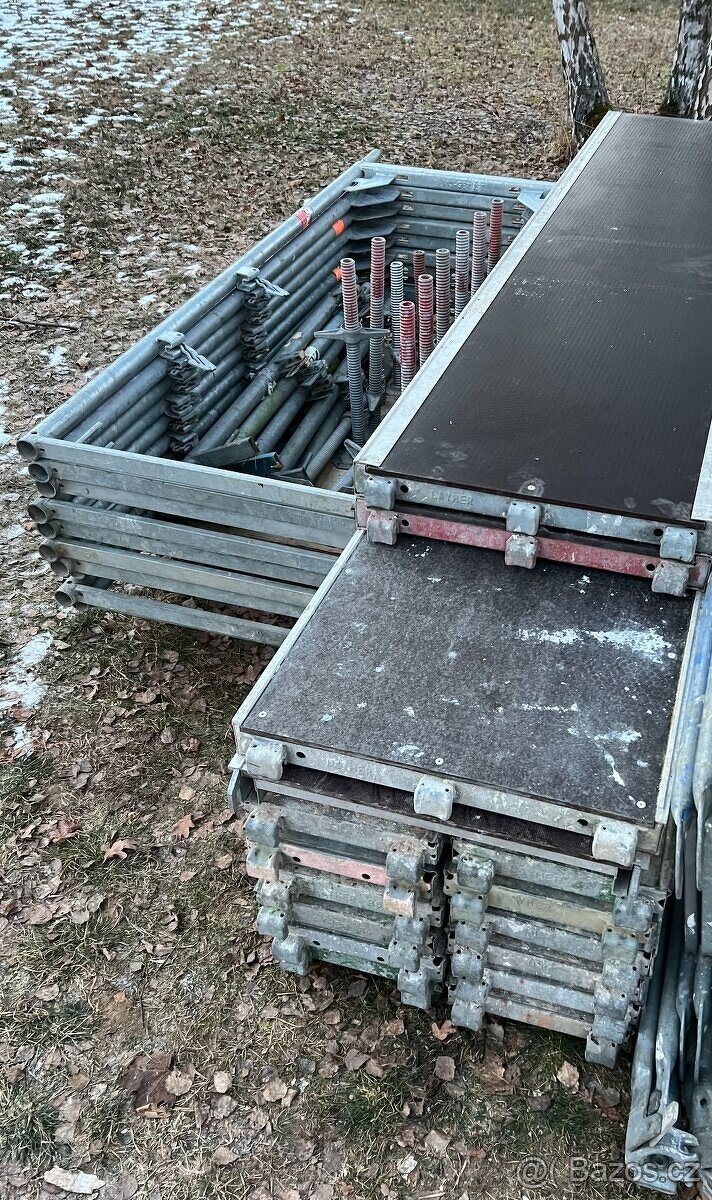 Prodám použité fasádní lešení Layher. Celková délka lešení 14,85m, pracovní výška 6,3m - 6,4m, pracovní plocha 93-95 m2. Viz obrázek.