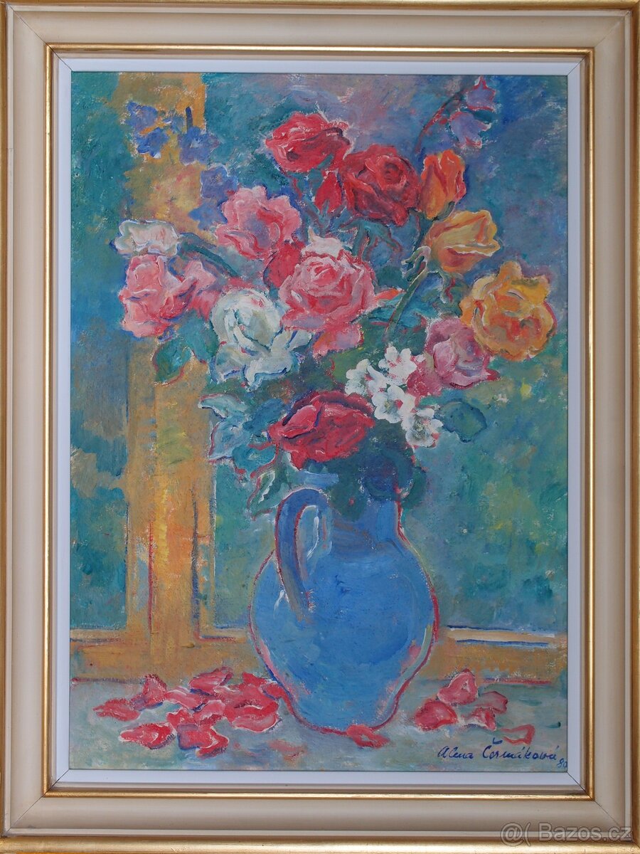 Prodám obraz “Růže v modrém džbánu“ malířky Aleny Čermákové. Olej na sololitu (kartonu). Rozměry obrazu 70x50 cm, rozměry rámu 84x64 cm. Cena 6900 Kč.