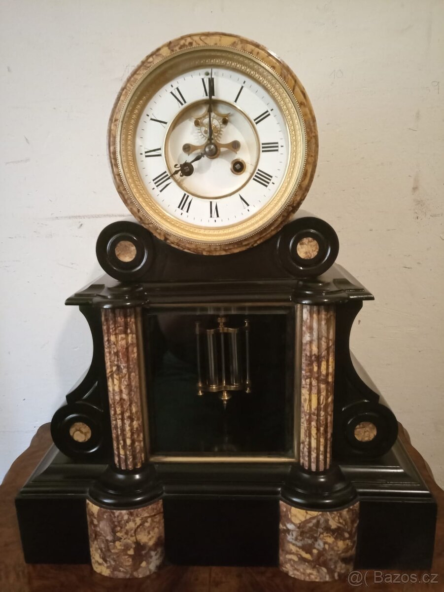 Impozantní velké mramorové hodiny s brokotovým krokem, okolo roku 1880, půlové bití na zvonek, na ciferníku je vidět kotva a krokové kolo, rtuťové kompenzační kyvadlo, funkční