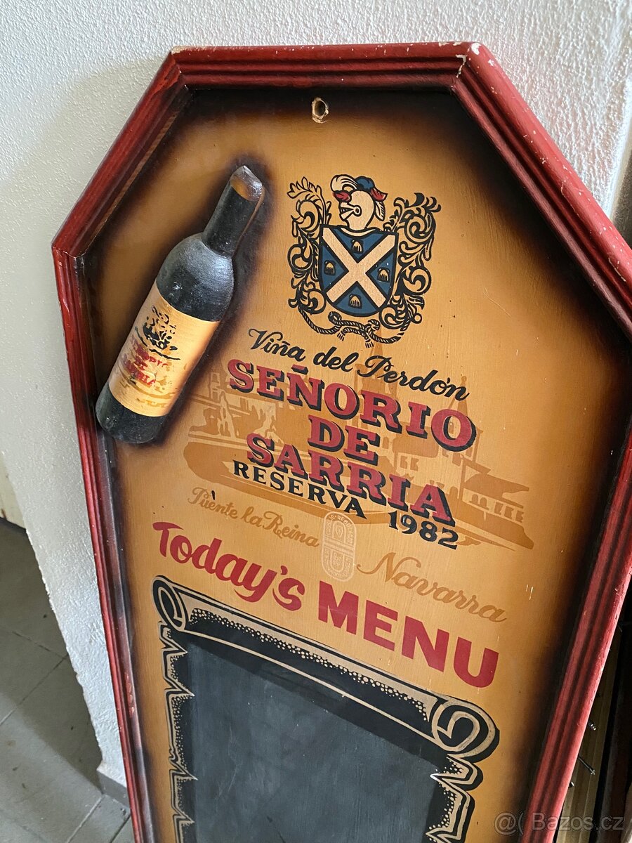 Prodám stylovou reklamní ceduli s motivem vína Señorio de Sarria Reserva 1982. Cedule má dřevěný rám, plastický dekor s lahví a spodní část je řešená jako tabule na psaní křídou – ideální pro restauraci, vinárnu, bar nebo jako originální dekorace do interiéru.