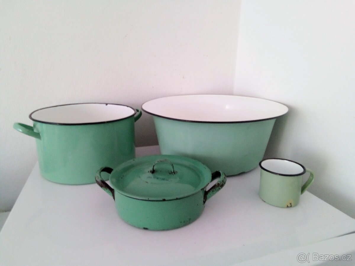 Staré, zelené, smaltované nádobí