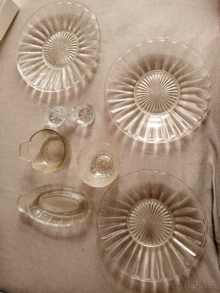 Součástí jsou 3 větší talíře a drobné skleněné doplňky (miska, dózička, těžítko/ozdoba, podnos).