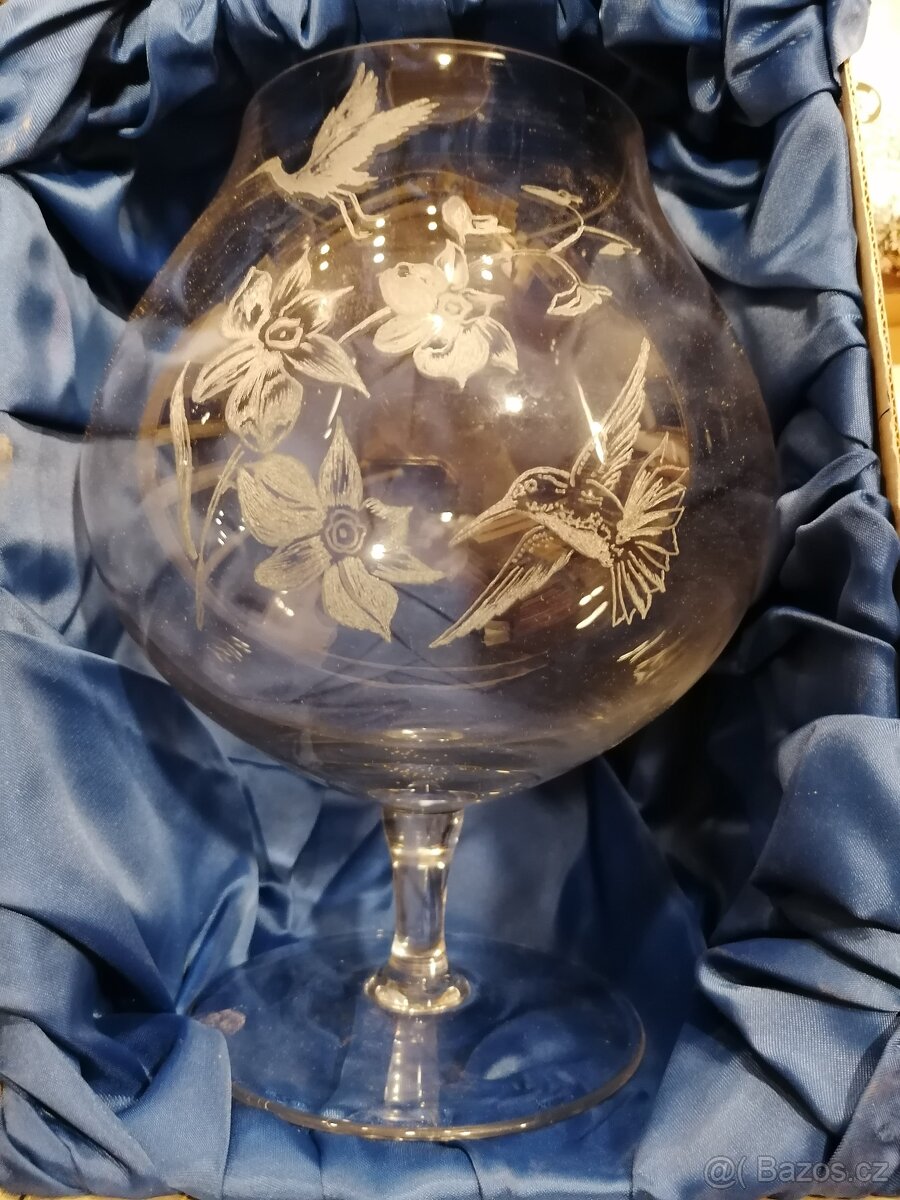 Prodám obří číši - motiv Jeřáb, Květy a Kolibřík (leptané) - výška 26,5 cm. Telefon 606146330. Prosím nevolat ve všední dopoledne.