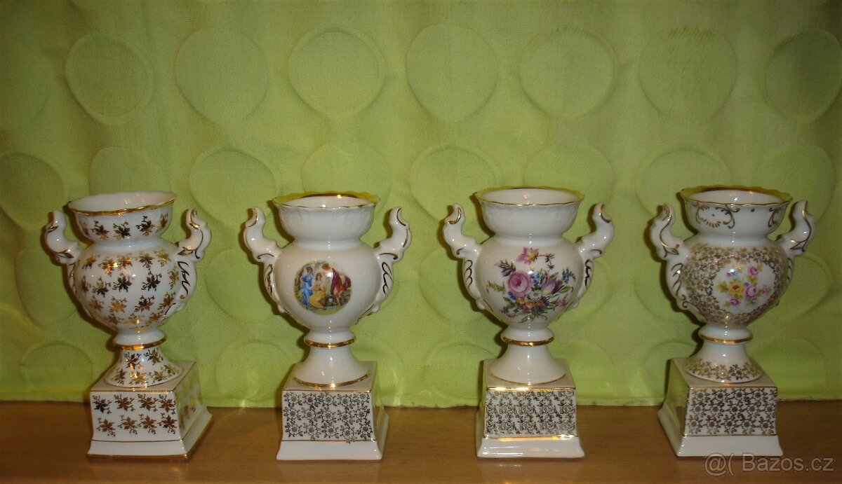 Prodám tyto čtyři nádherné porcelánové vázy ve tvaru amfory na pevném podstavci. Kvalitní český porcelán. Každá je jinak zdobená. Výška je 19 cm.
