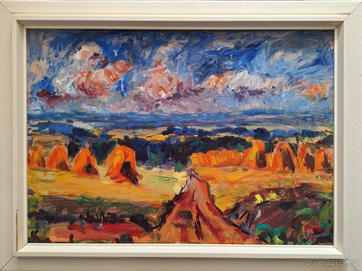 Letní krajina, olejomalba na kartonu o rozměrech 49x69 cm, lehce poškozený rám 60x80 cm, signováno, datováno 1961.