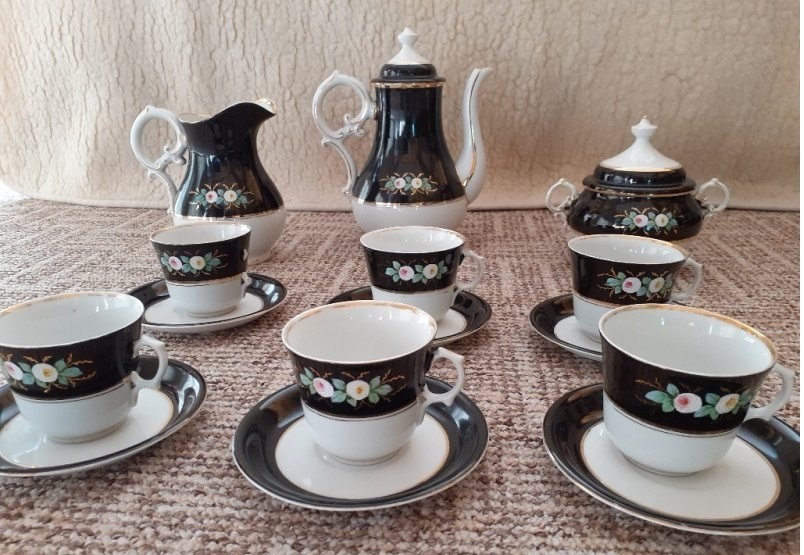 Prodám starožitný čajový servis (dědictví), černobílý zdobený květy. Stáří více než sto let. Na jednom hrníčku chybí ucho a jeden poklop je slepovaný ( zohledněno v ceně), avšak při vystavení ve vitríně to není vidět. Vhodné spíš pro sběratele. Pouze osobní převzetí v UH nebo okolí.