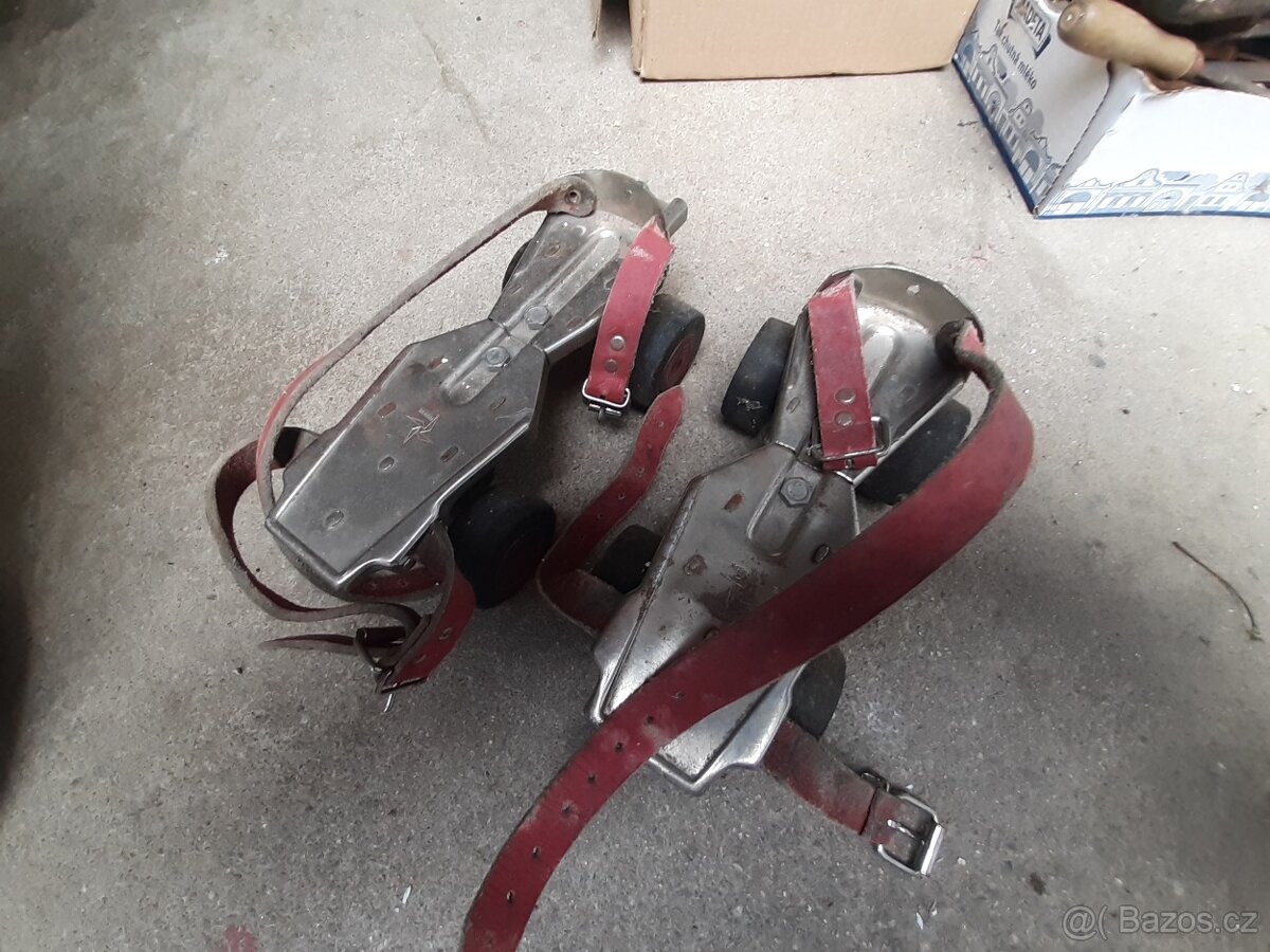 Prodám starodávné kolečkové brusle, velikost lze přizpůsobit posuvem na jakékoliv boty. Stáří cca 50 let. Pro sběratele dětských hraček a sportovních potřeb krásná záležitost. Cenu nabídněte, prosím.