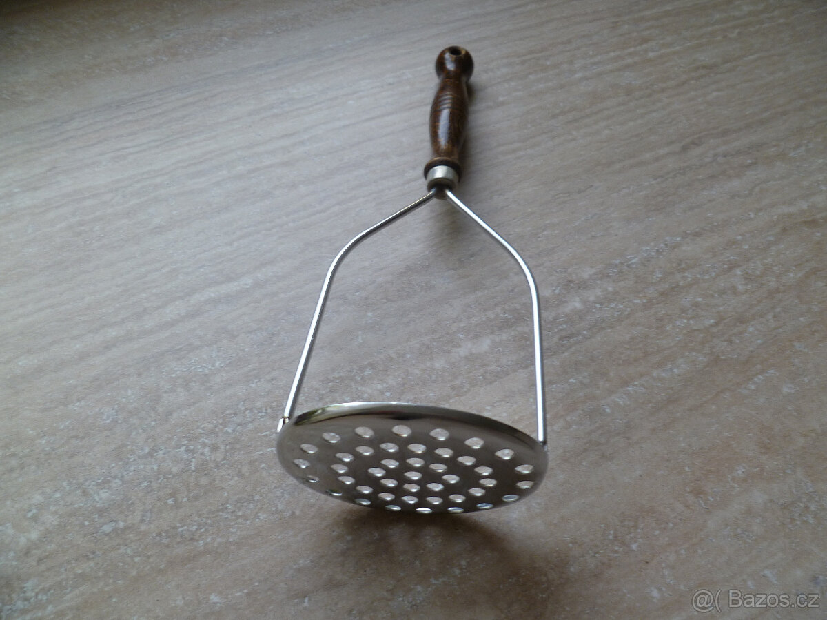 Prodám levně nerez mačkadlo na brambory, dřevěná hnědá ručka, možno zavěsit, pěkné, možno využít i jako sběratelský kousek