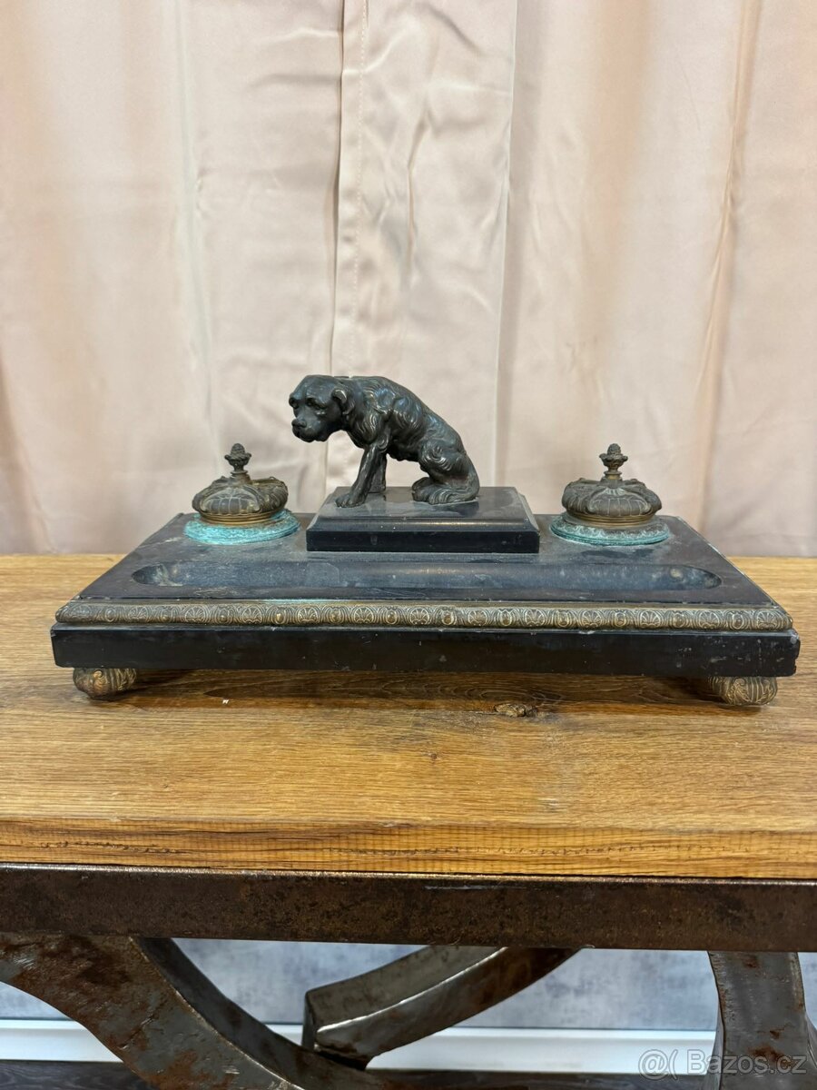 Tato reprezentativní psací souprava z přelomu 19. a 20. století pochází pravděpodobně z Francie. Kombinace masivního kamenného podstavce (mramor / břidlice), bronzových inkoustových nádob a detailně modelovaného psa vytváří silný dekorativní celek.