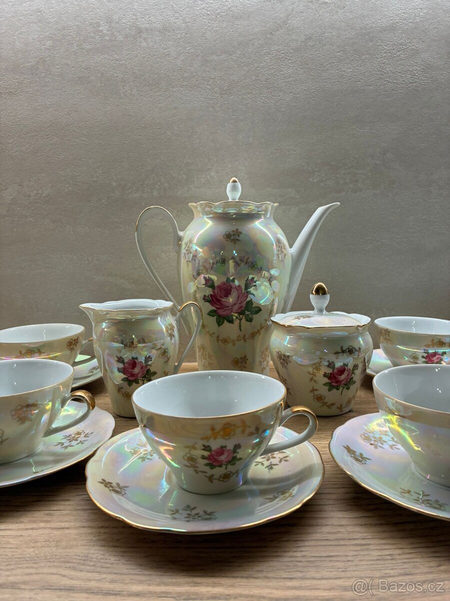 6ks šálků s podšálkem, cukřenka, dóza na mléko, čajová konvice a 6x dezertní talířek