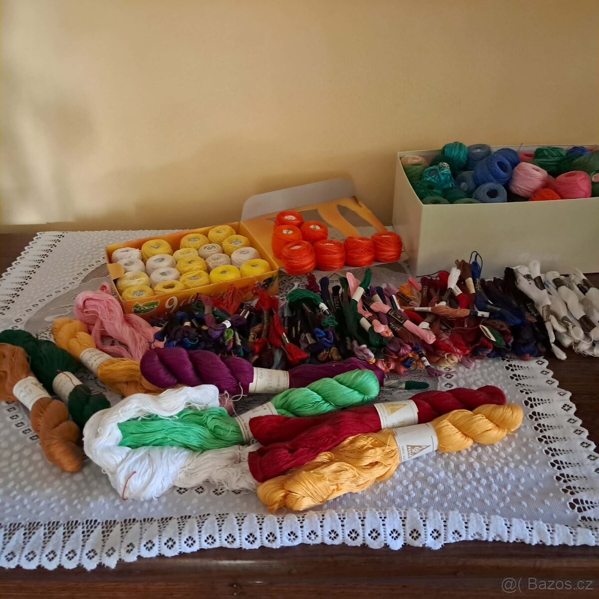 Nabízím větší množství bavlnek na vyšívání + různé předlohy,velké ubrusy,malé dečky i polštářky.