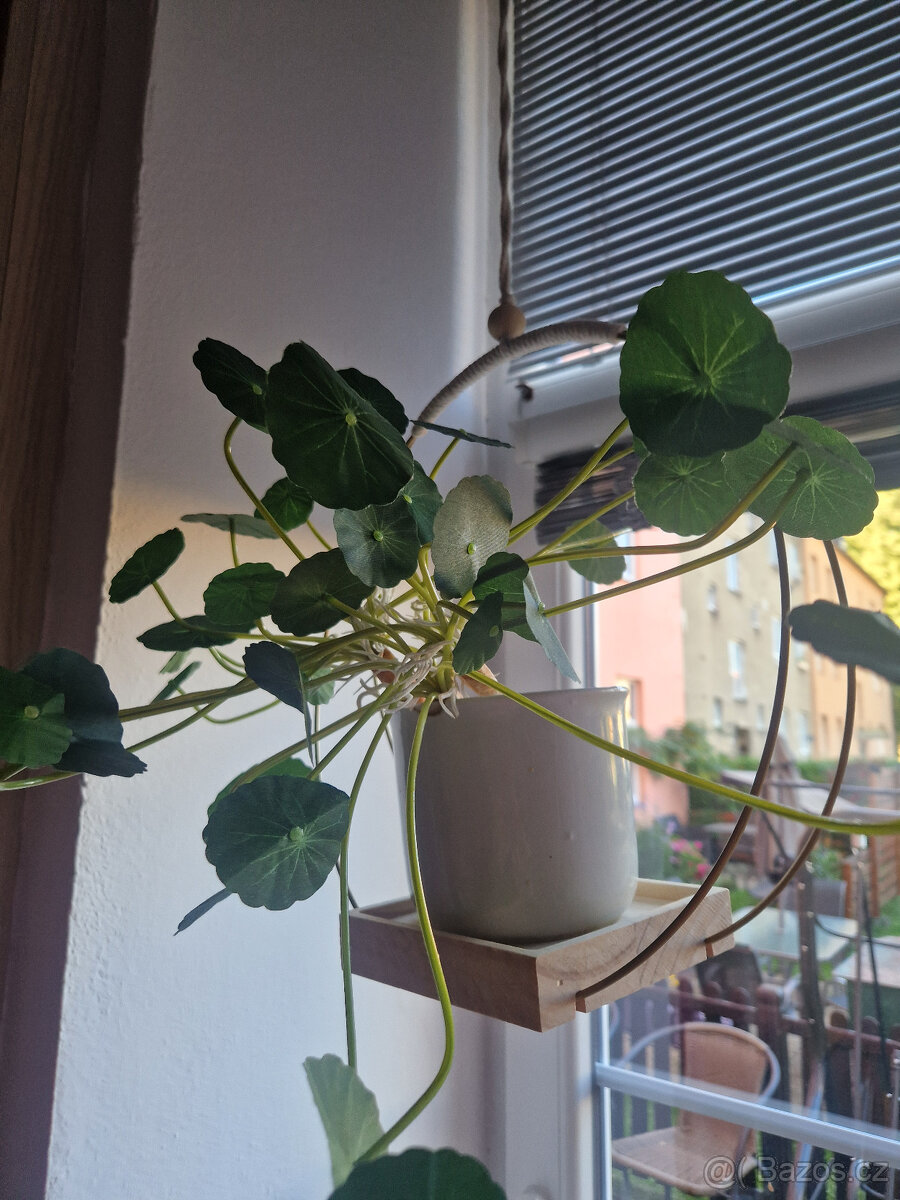 Prodám nový závěs na květiny do okna ve stylu BOHO.Dva kovové zlaté kruhy spojené dřevěnou destičkou.Uchycené tkanou šňůrou s dřevěnou kuličkou na zavěšení.Bez květináče/je jen na ukázku/