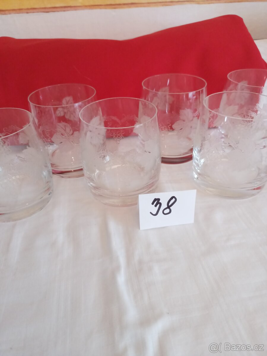 Skleničky s rytým dekorem hroznového vína a listů,křišťálové sklo , pravděpodobně Moser.Oťuk u jedné sklenice , viz obrázek