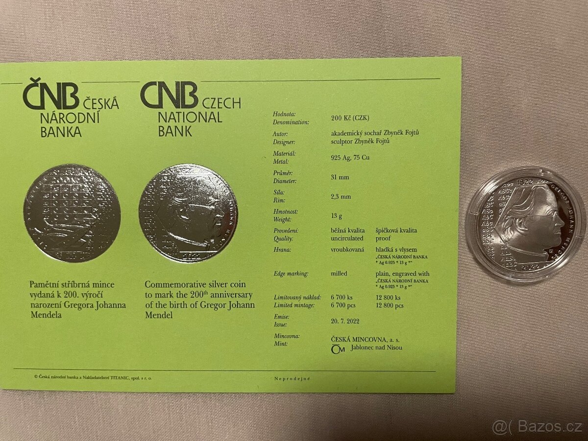 Prodám minci ČNB Johann Gregor Mendel