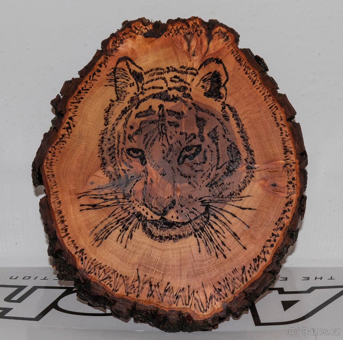 Dřevo olše 26/3cm. Ručně vypalovaný vzor tygra. Kůra opatřena lakem a povrch včelím voskem a pomerančového oleje. Ozdoba na Váš stůl, popř. si můžete připevnit držák a zavěsit na zeď.