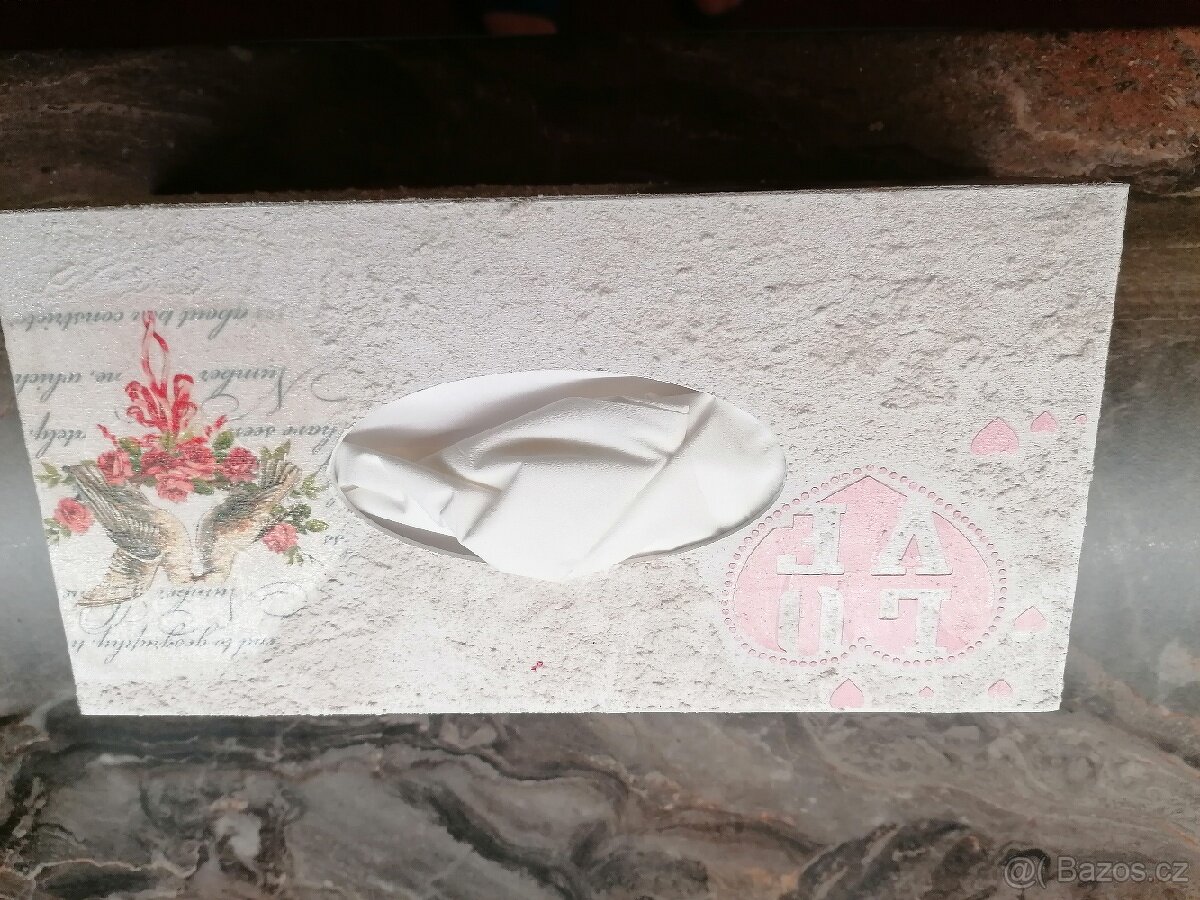 Prodám tuto ručně vyrobenou dřevěnou krabičku na papírové kapesníky. Víko je posunovací a lze vložit celou krabici kapesníků. Ručně vyrobena, moc krásná, ale nevyužiji.