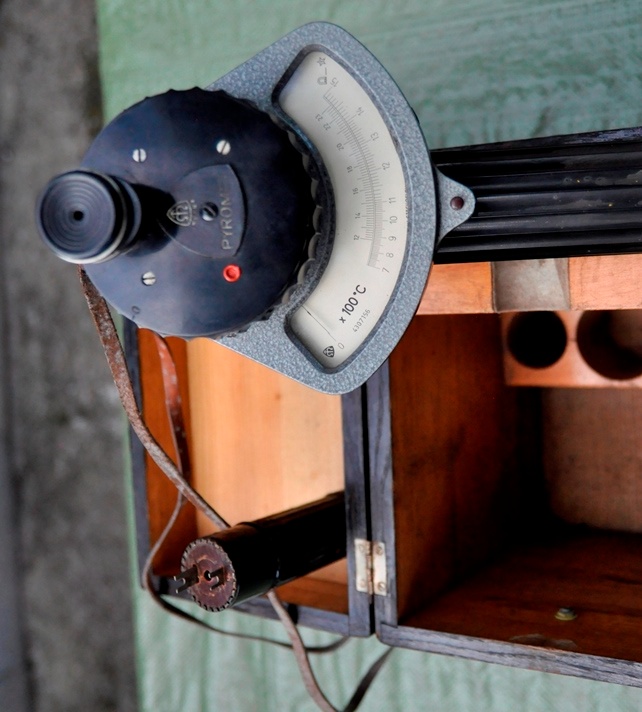 Nabízím k prodeji raritní starožitný a funkční optický pyrometr od Metry Blansko, který funguje k měření teplot do 1500 st.Celsia. Napájení je přes 2 velké monočlánky. Plechový držák baterií je trochu orezlý, ale funguje.