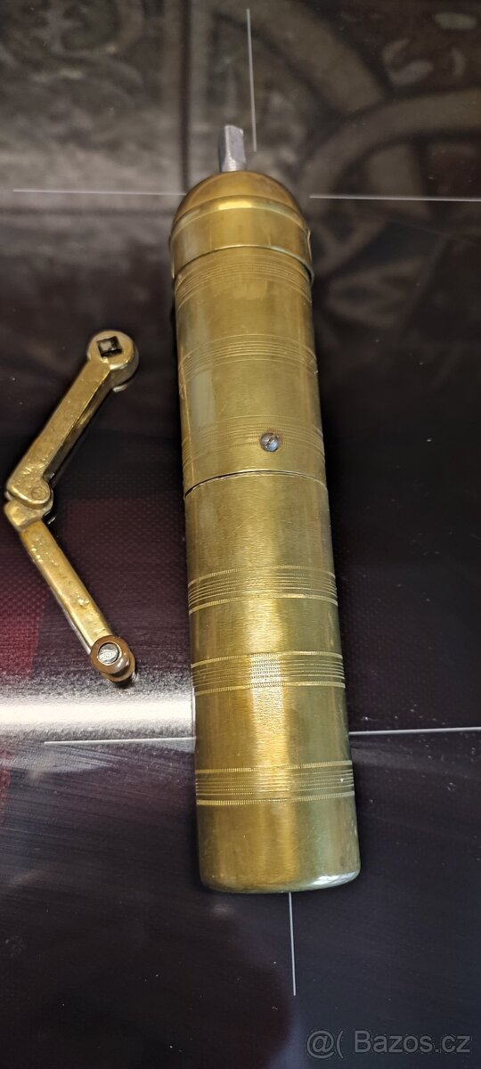 Nabízím k prodeji funkční mosazný mlýnek na kávu původem z Albánie. Délka 22 cm průměr 4,5 cm. Viz foto. Dobírkou.
