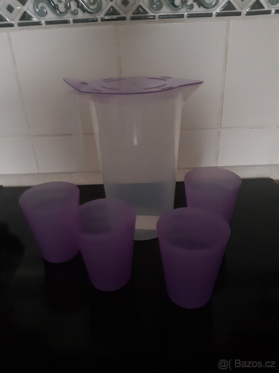 Nabízím nápojovou soupravu z polypropylénu, 4 kalíšky, konvice s odklopným víčkem na 2 litry tekutiny. Nepoužitá, praktická, lehká za 80.-Kč. Tel. 732 187 597.