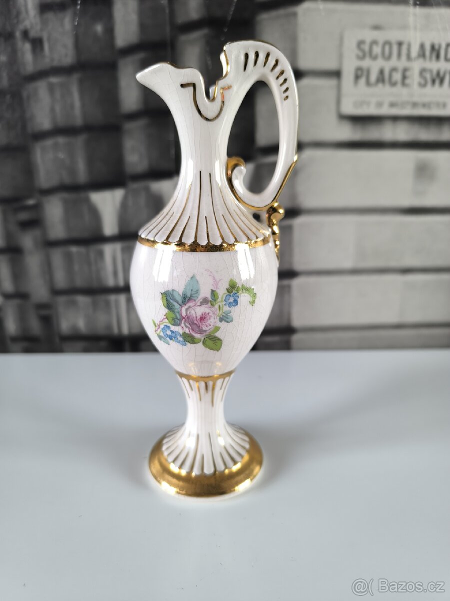 Prodám starožitnou keramickou vázičku zdobenou jemným květinovým vzorem, zlatými akcenty a charakteristickým krakelováním glazury.