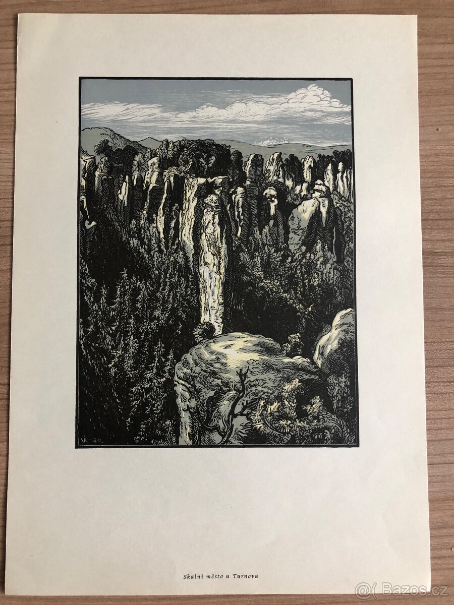 Nabízím dřevoryt Skalní město u Turnova od Karla Vika (1883-1964).Rozměr tisku 14,5 x19,5 cm na formátu A4. Stav fota- tisková plocha perfektní.Malinko pomačkaný levý okraj (ne tisk).Vhodné k zarámování.Nevolat, v případě zájmu posílat dotaz přes nabídkový formulář níže. Posílám zásilkovnou za 80-Kč