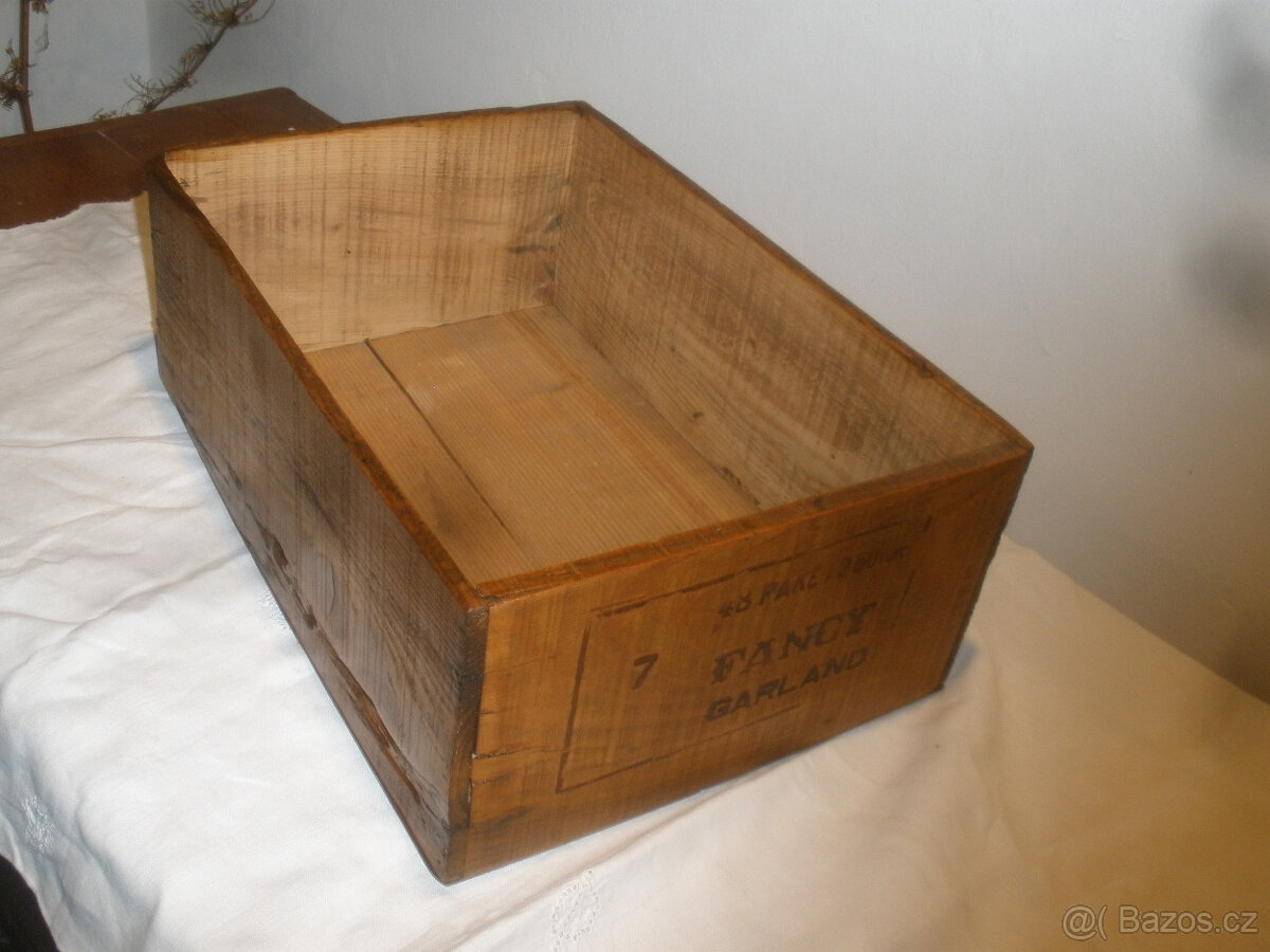 Stará dřevěná bedýnka,nápis FANCY GARLAND/luxusní girlandy,ozdoby,48PAKET zn. ARIS,rozm 27X39X14.5cm,stav viz foto,ošetřeno voskem.Osobní předání Mělnicko nebo posílám poštou