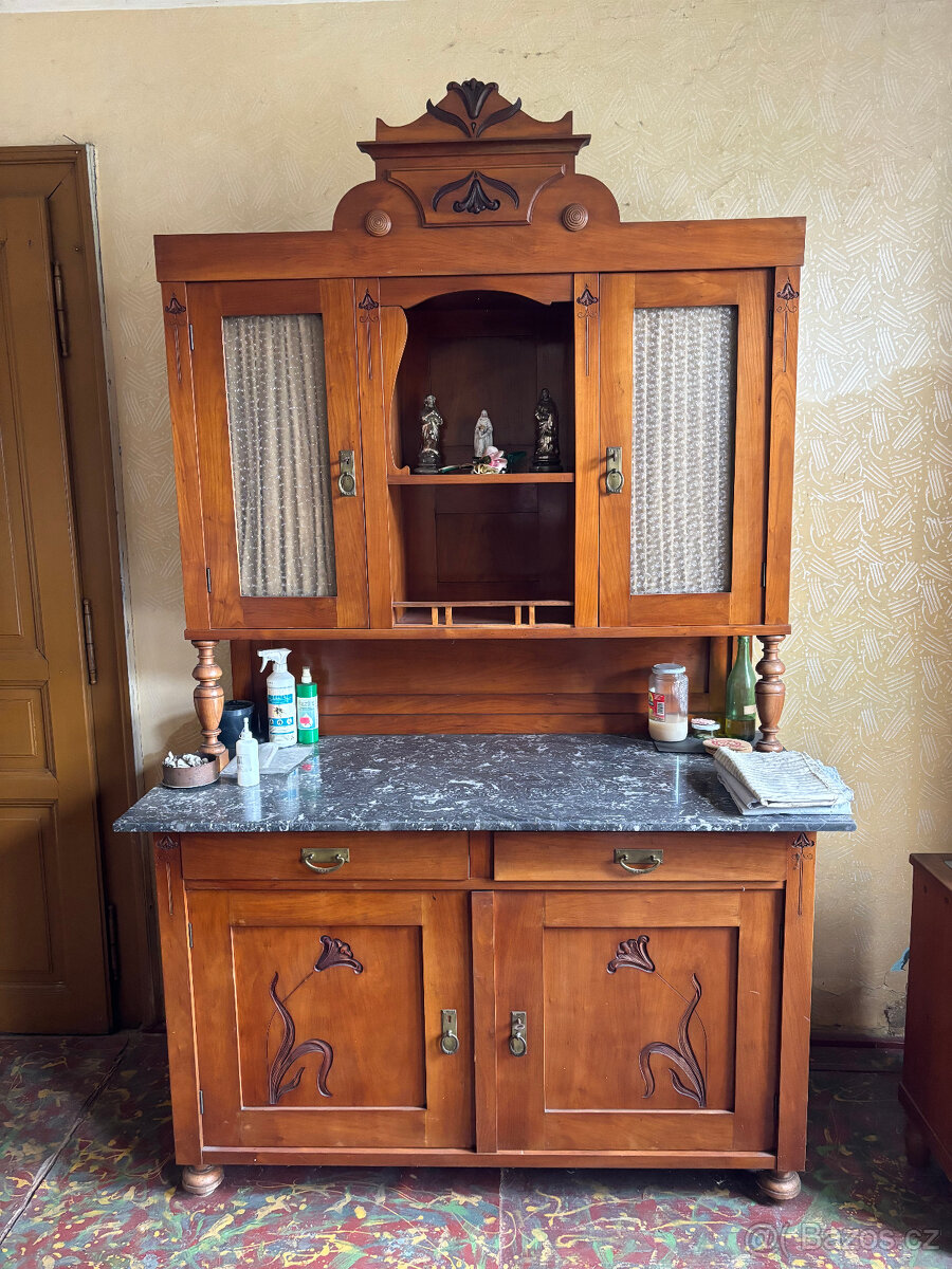 Dobrý den. Nabízím starý kuchyňský kredenc styl pozdní secese nebo rané art deco (cca 1900-1930), květinové řezby na dvířkách,dvoudílná konstrukce,mramorová deska a ozdobná koruna nahoře, původní kování.Rozměry:V:230CM,š:140CM,H:65 CM. Platba v hotovosti a osobní odběr.