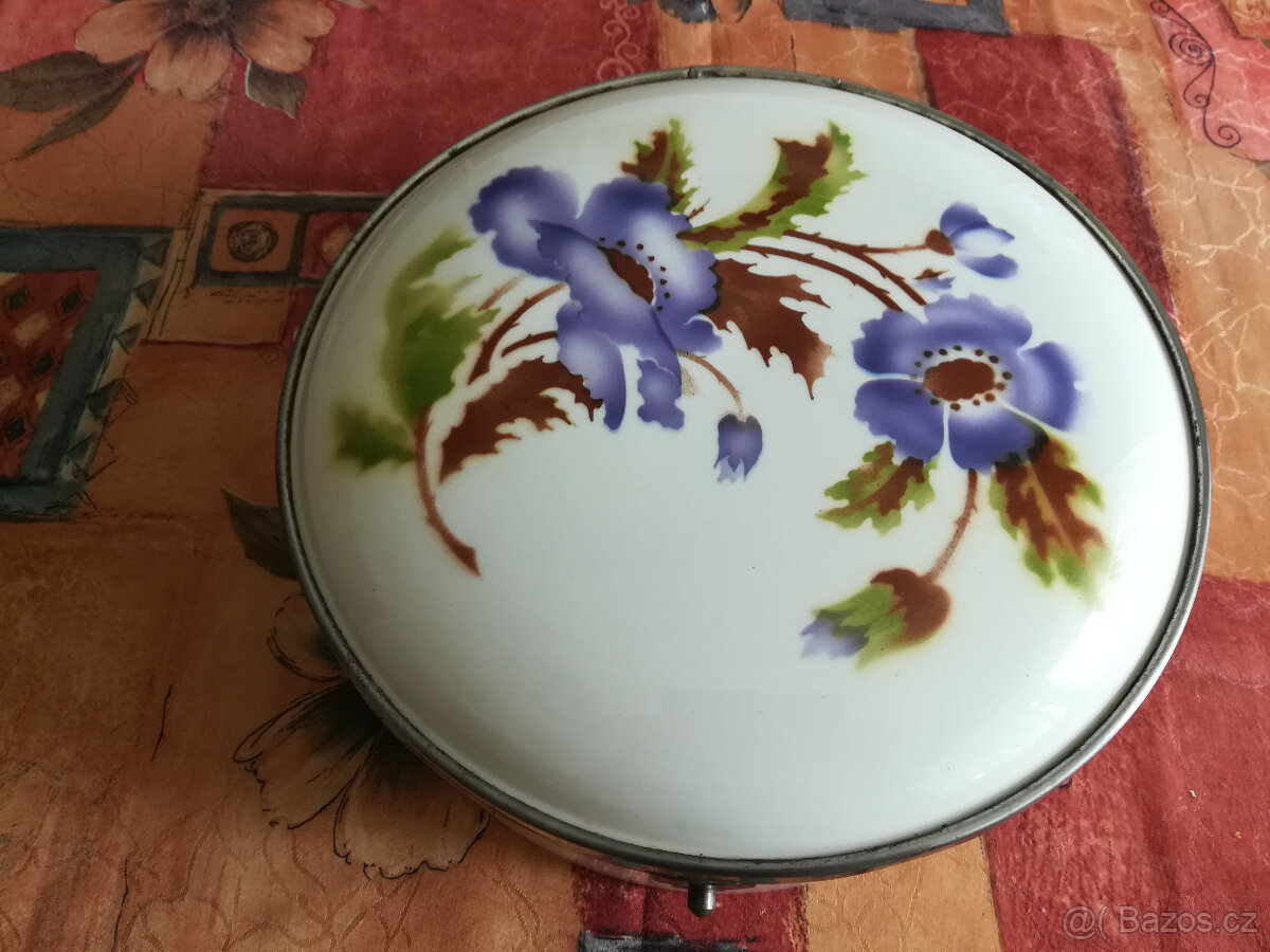 Prodám starožitný porcelánový chlebník velmi zachovalý. Průměr chlebníku je 30 cm a výška 12 cm.