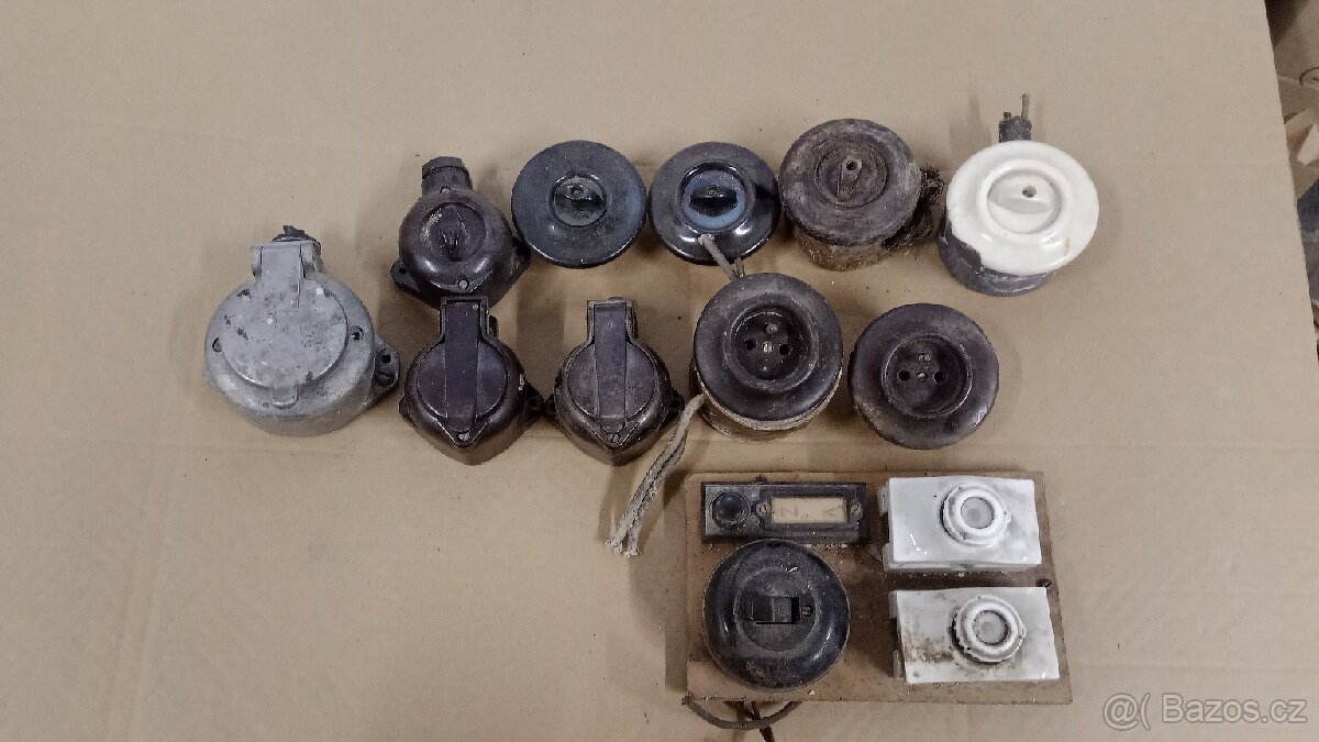Prodám staré El.vypínače a zásuvky . Vhodné pro historické památky,stodoly,statky,roubenky,..... Cena za celek 1400kc více informací po tel.