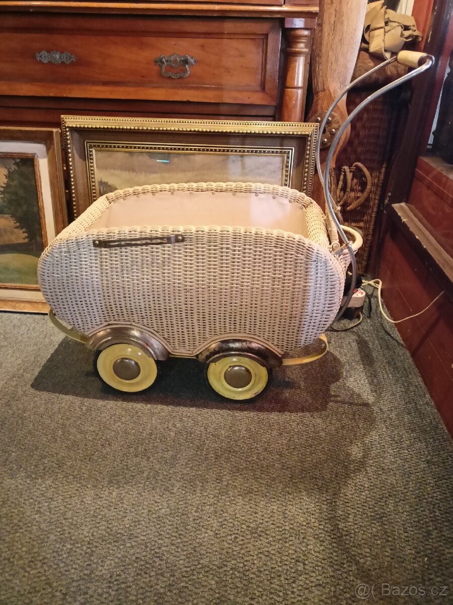 Proutěný kočárek pro panenky.