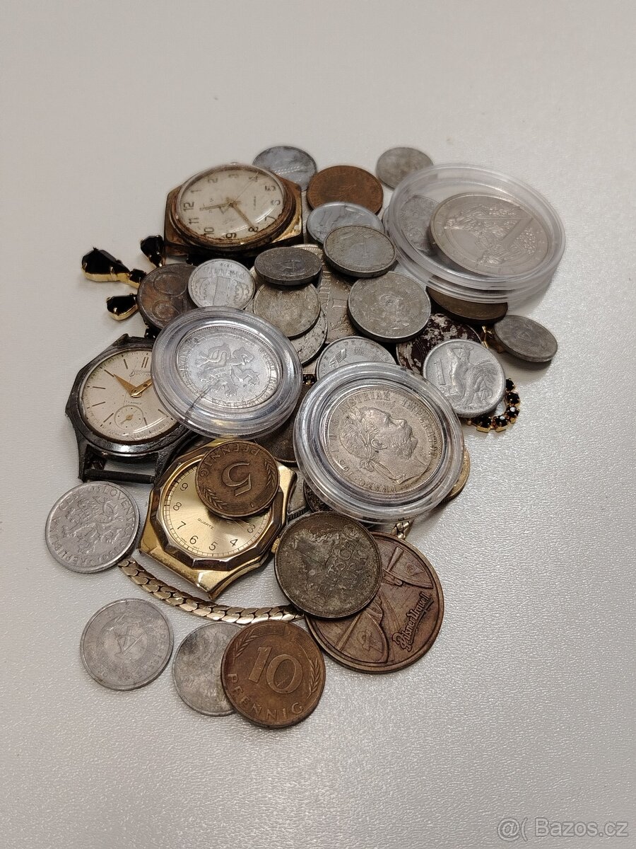 Mince. Stříbro. Hodinky. Náramky