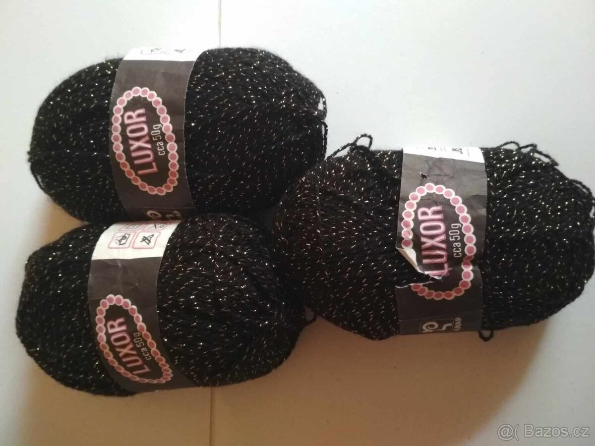 Černá pletací příze Luxor- 150g- se zlatou nitkou, vhodná pro pletení či háčkování. Složení: 89 %PAN, 11% PAD. Poštovné připočítám k ceně.
