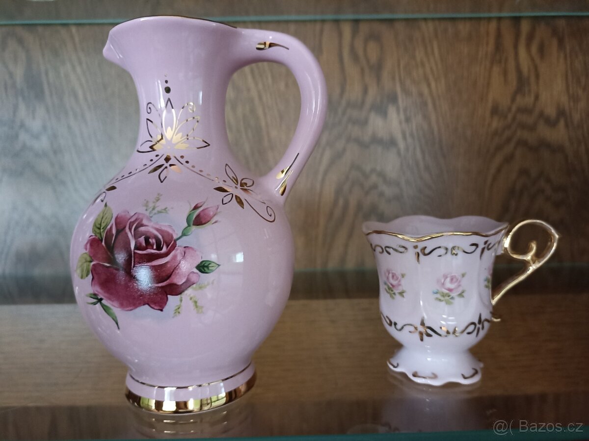 Džbánek+šálek z růžové keramiky 150,-